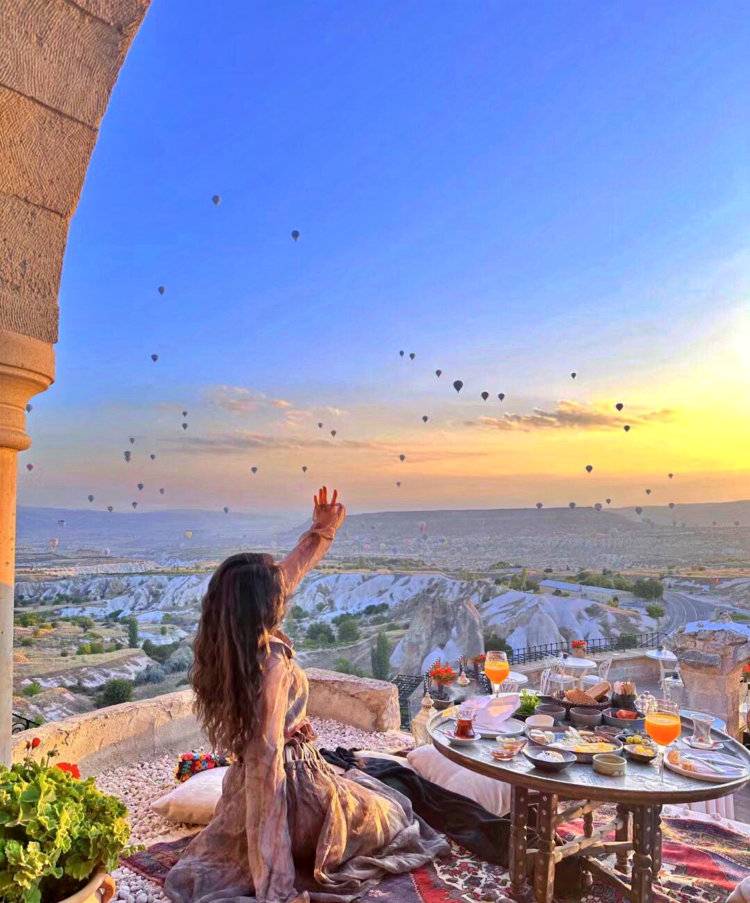 - Lựa chọn 1: Bay khinh khí cầu đón bình minh: Quý khách sẽ có cơ hội chiêm ngưỡng toàn cảnh Cappadocia từ trên cao trong khoảnh khắc bình minh rực rỡ, khi mặt trời từ từ ló rạng giữa hàng trăm quả bóng bay sặc sỡ. Sau khi hạ cánh, quý khách sẽ được tham gia một buổi tiệc nhẹ ấm cúng với bánh ngọt và rượu champagne, và nhận chứng nhận (certificate) như một món quà lưu niệm đánh dấu hành trình đặc biệt này.