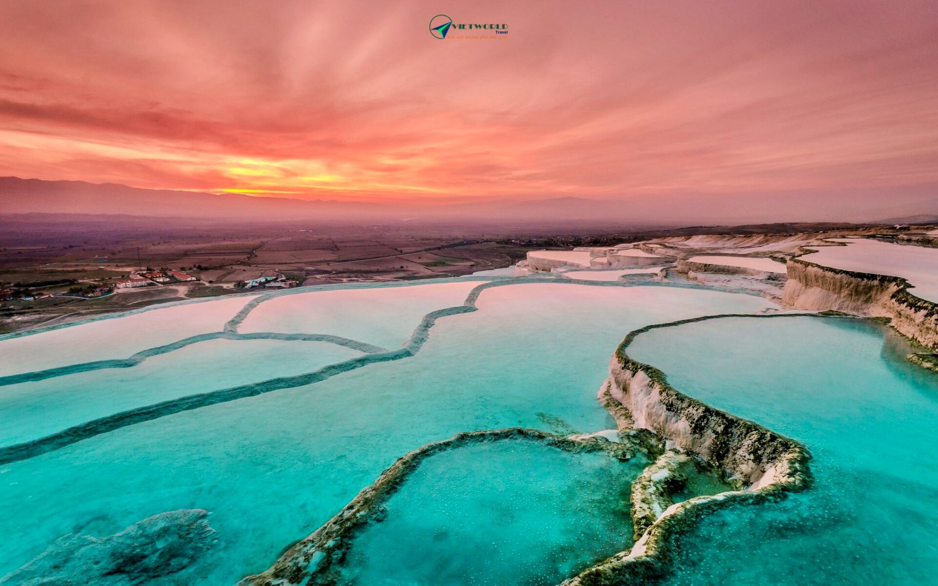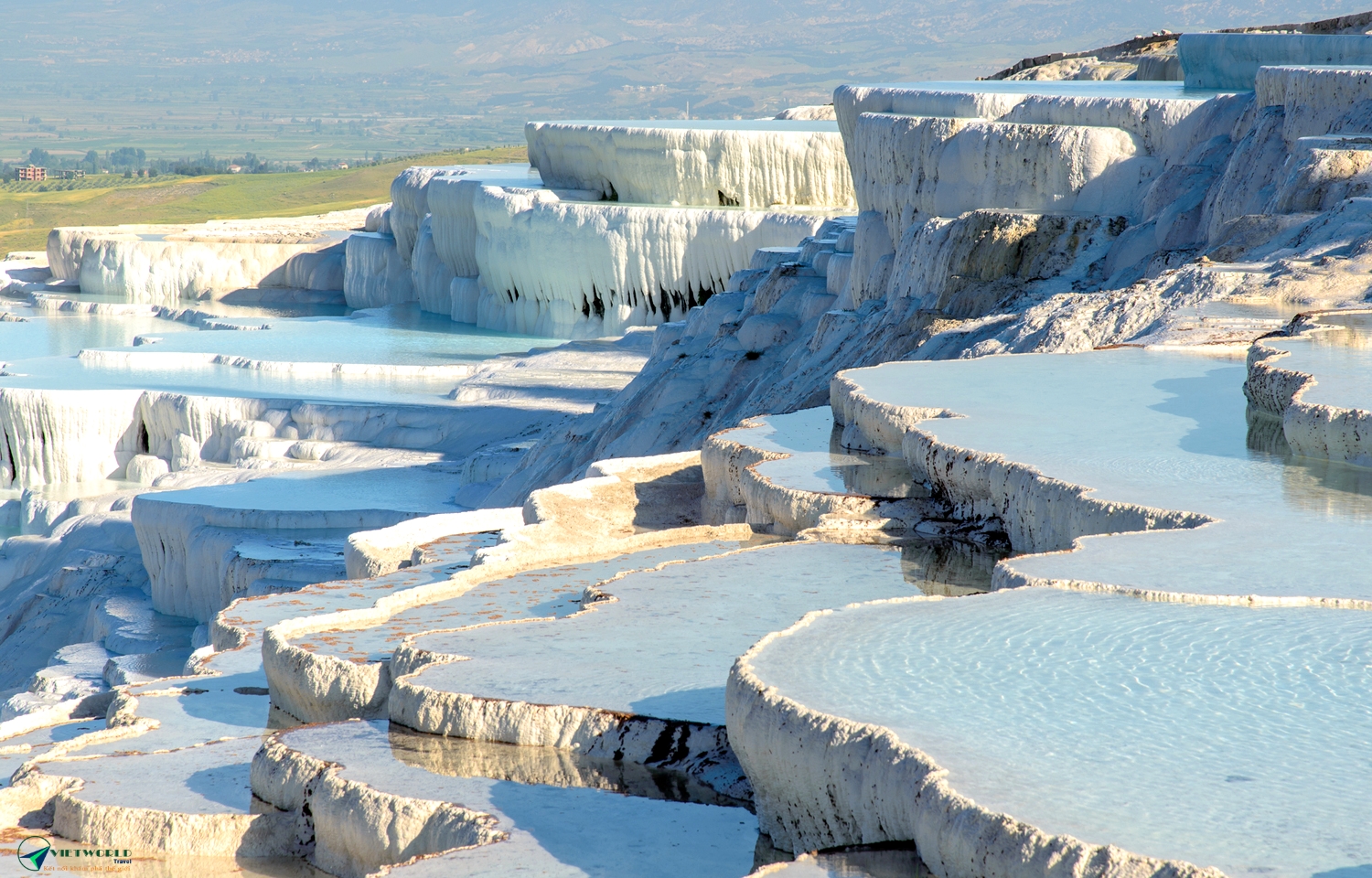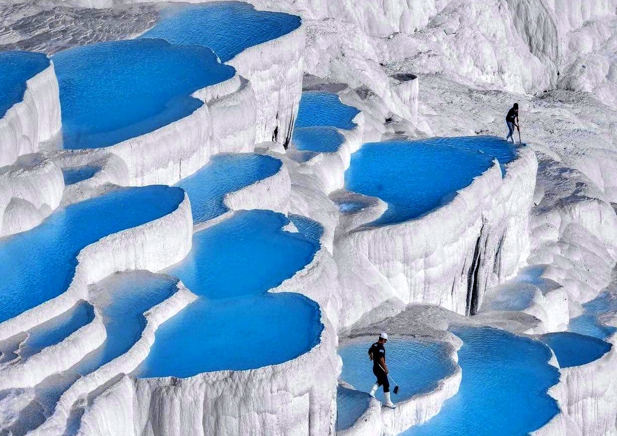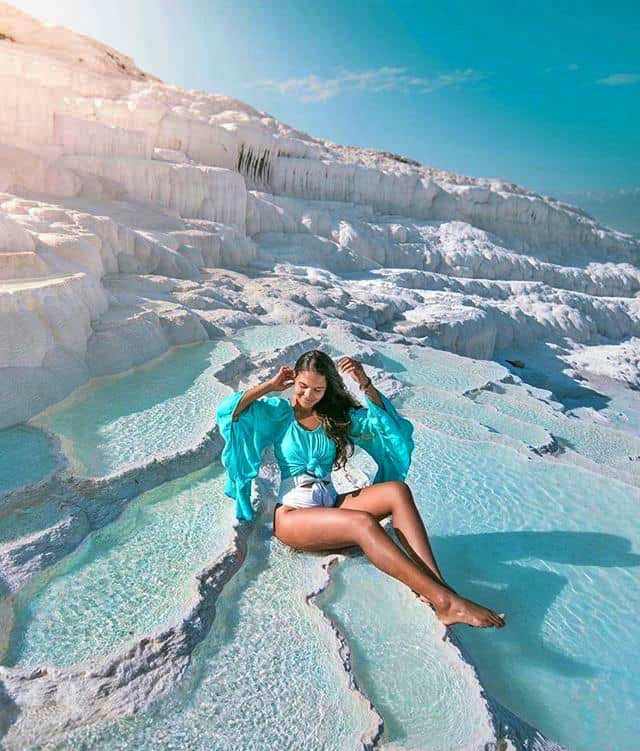 - Lâu đài Bông Pamukkale – Viên ngọc trắng của Thổ Nhĩ Kỳ, hiện ra như một dải lụa tuyết mềm mại vắt ngang triền núi. Từng tầng đá vôi trắng tinh khôi, qua nghìn năm bồi đắp bởi dòng suối khoáng nóng giàu khoáng chất, tạo nên những hồ nước xanh ngọc bích lấp lánh dưới nắng. Vẻ đẹp nơi đây tựa như bước ra từ một giấc mơ cổ tích, nơi trời và đất giao hòa trong sắc trắng – xanh thanh khiết. Từ thời La Mã cổ đại, Pamukkale đã là chốn nghỉ dưỡng và chữa lành, níu chân lữ khách bằng sự yên ả và vẻ quyến rũ vượt thời gian, nhất là khi hoàng hôn nhuộm vàng cả “lâu đài” bồng bềnh này.